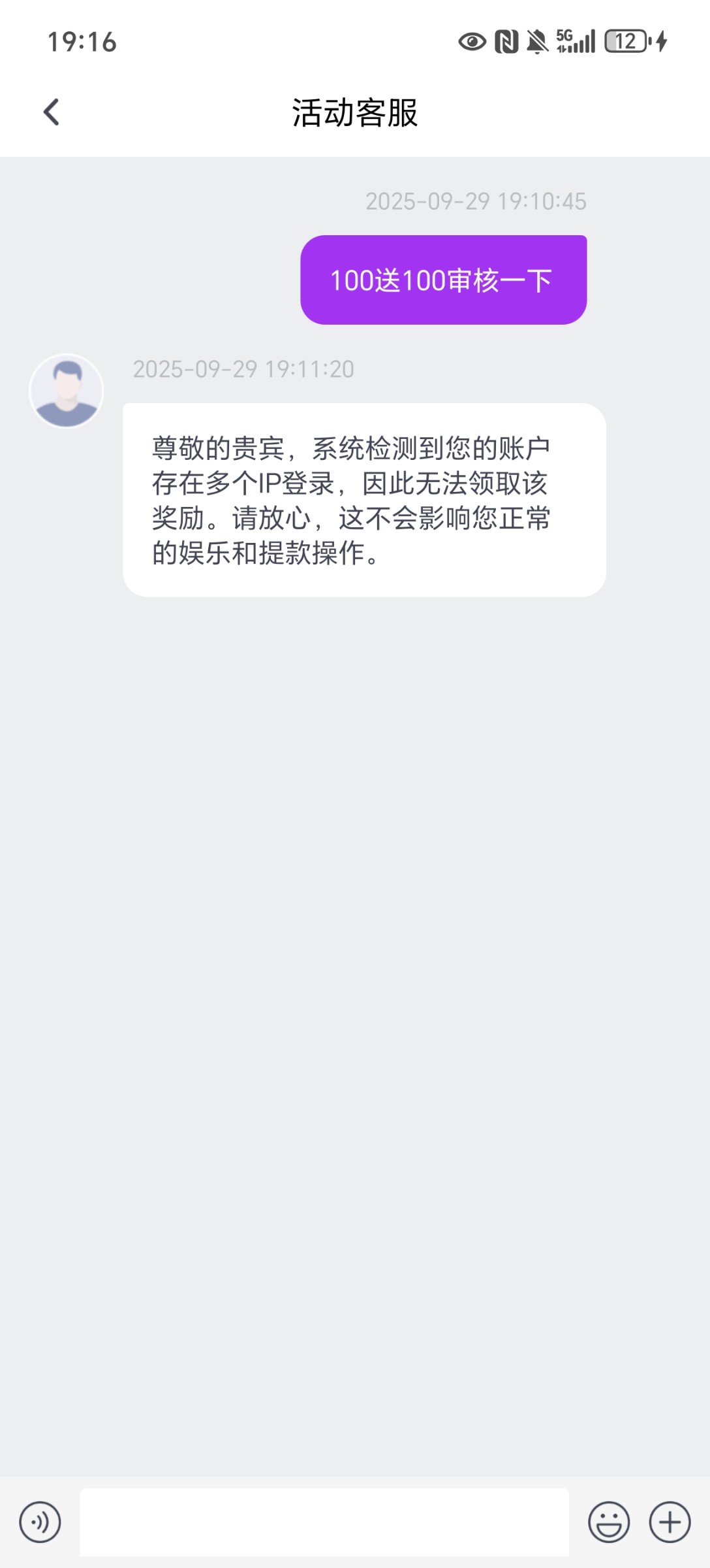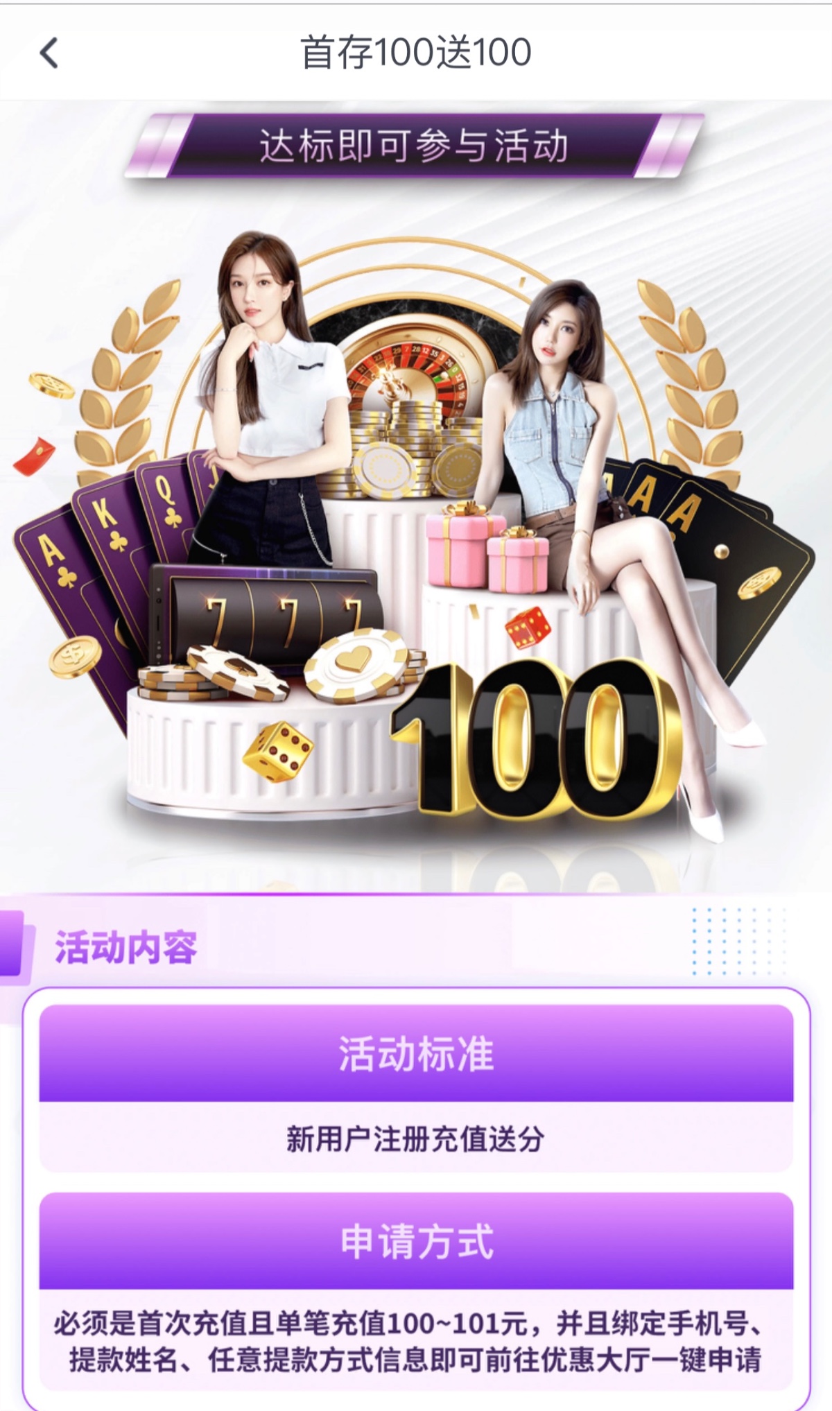 活动:新用户首存100+100(只能娱乐电子游戏(不能买免费),井且满足5倍流水最低提款588元最高也是588)首存活动只能参加一个参加100+100其他首存活动都无法参与,本活动仅限独立账户参与,如同一姓名、同一手机号、同一IP.同一银行卡账户多账户均不参与,该活动需要在未下注前申请