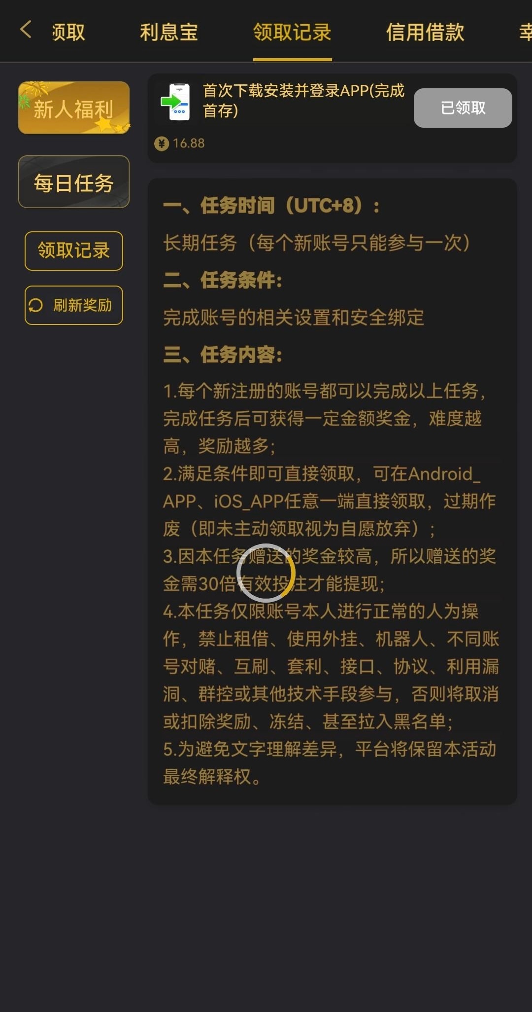 新人首充20领16.88下载app彩金,第二天还可以领特邀彩金,活动优惠的流水要求比较高,充值了建议真人打流水出款提回去然后领彩金白嫖