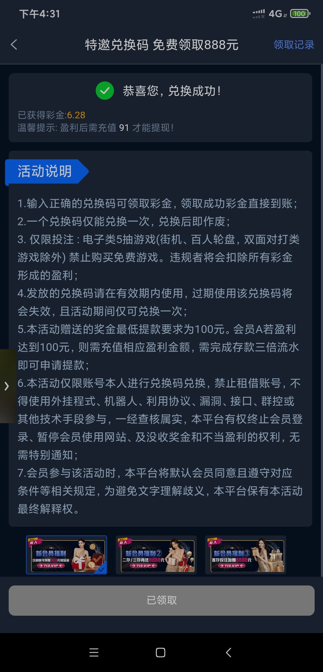 领了6块打到1000需要充值多少?冲100可以吗?